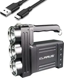 Linterna ergonómica de alta potencia, recargable, impermeable y atenuable, con luz para hasta 135 horas y 570 metros. Tiene función powerbank para cargar móviles.