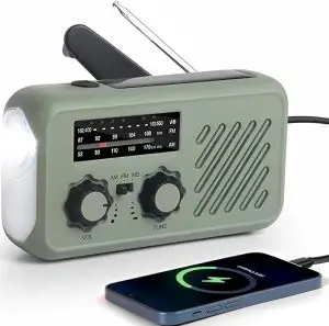 Radio portátil AM, FM y WB, con linterna y botón SOS. Funciona mediante batería recargable, panel solar o manivela dinamo. Incluye función PowerBank.